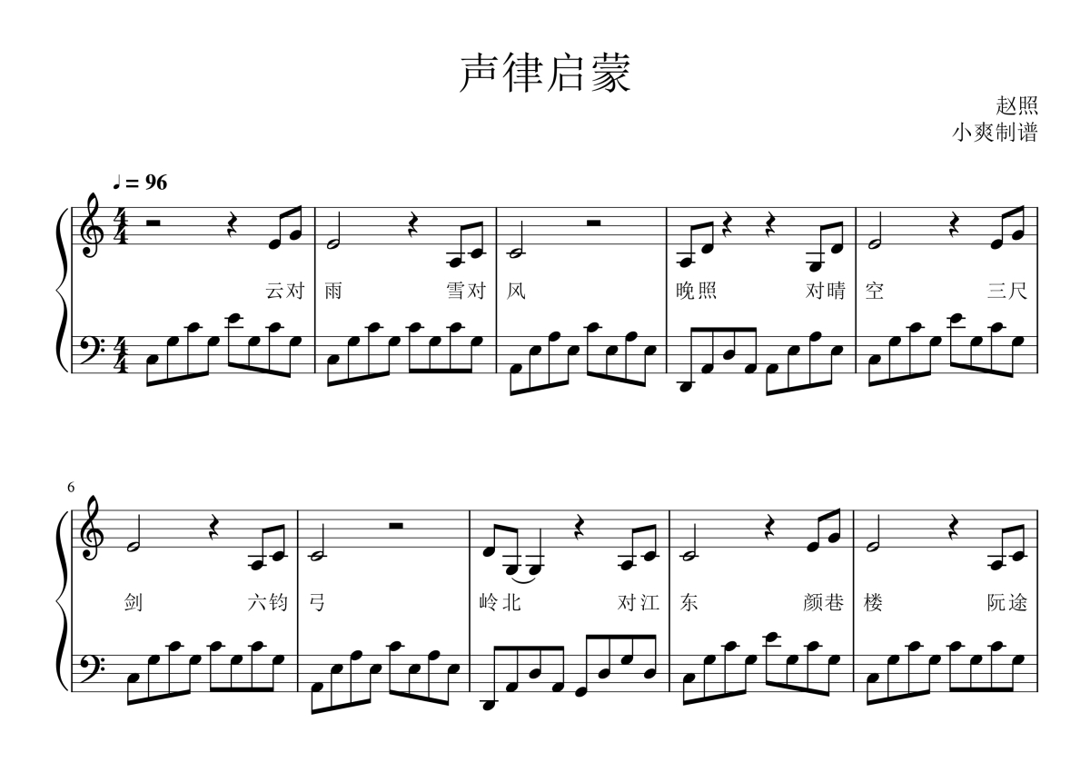 《声律启蒙》是赵照演唱的一首歌曲,这份钢琴谱共有两张高清图谱,图谱由 @酷玩吉他 编配上传,使用这份声律启蒙钢琴谱,可以让你更加方便地掌握这首歌曲的演奏技巧,快来尝试吧。赵照《声律启蒙》钢琴谱。