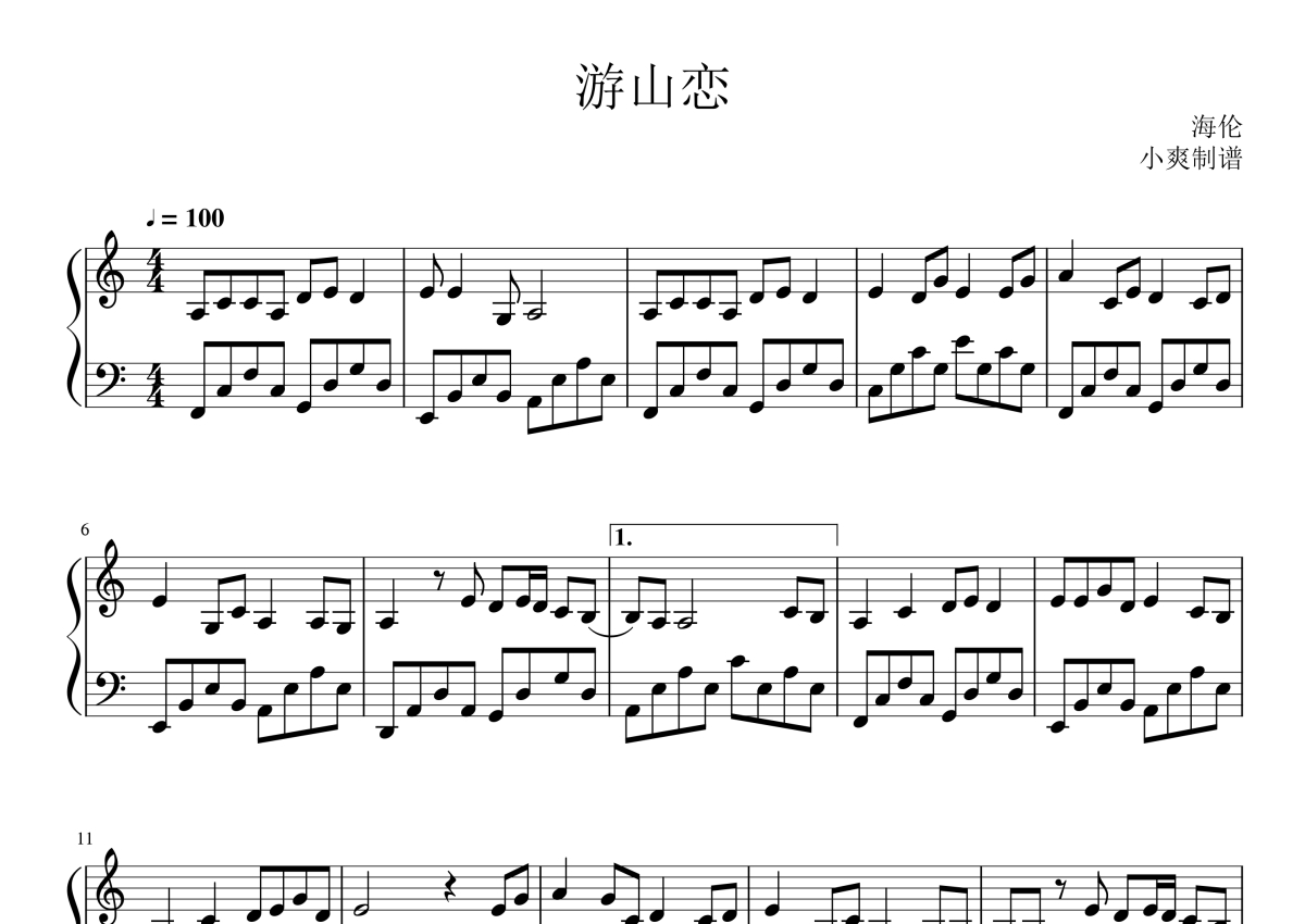 《游山恋》是海伦演唱的一首歌曲,这份钢琴谱共有两张高清图谱,图谱由 @酷玩吉他 编配上传,使用这份游山恋钢琴谱,可以让你更加方便地掌握这首歌曲的演奏技巧,快来尝试吧。海伦《游山恋》钢琴谱。