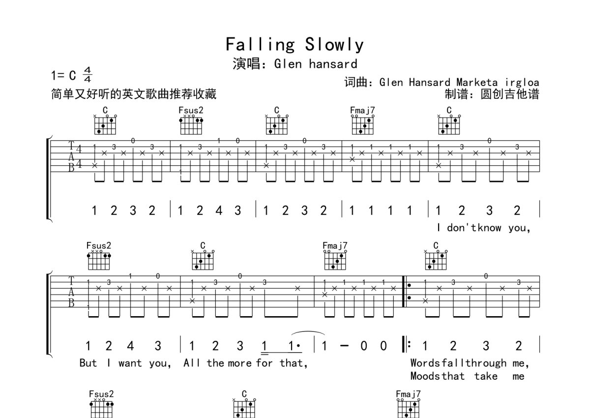 Glen hansard《Falling Slowly》吉他谱 - C调弹唱六线谱 - 分解加扫弦编配