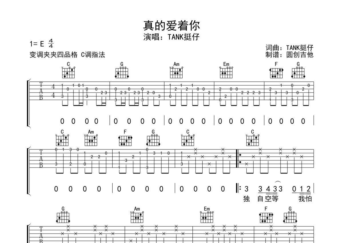 TANK挺仔《真的爱着你》吉他谱 - C调弹唱六线谱 - 分解加扫弦编配