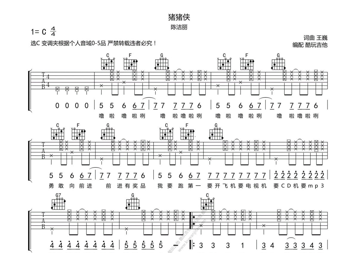 陈洁丽《猪猪侠》吉他谱 - C调弹唱六线谱