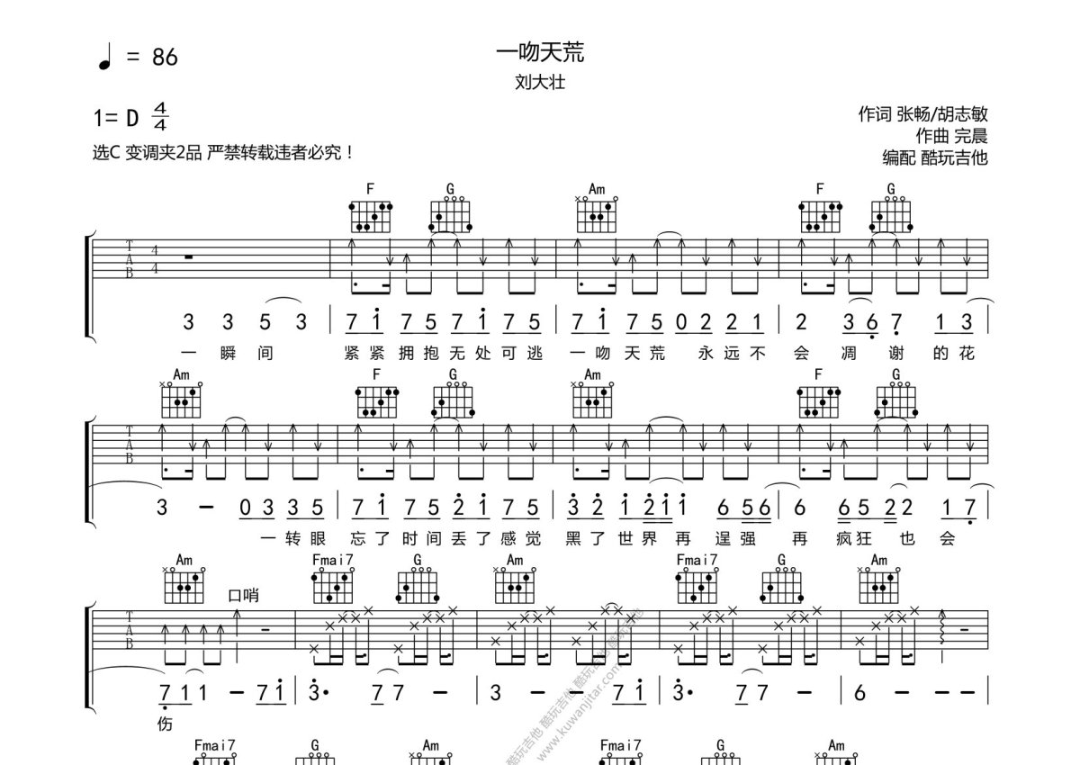《一吻天荒》是刘大壮演唱的一首歌曲,本吉他谱采用的是C调指法编配,这份吉他谱共有两张高清图谱,图谱由 @酷玩吉他 编配上传,图谱使用六线谱编配,包含吉他和弦指法、简谱以及歌词部分,曲谱配备了相关的音频提供试听,使用这份一吻天荒吉他谱,可以让你更加方便地掌握这首歌曲的弹唱技巧,快来尝试吧。刘大壮《一吻天荒》吉他谱_C调吉他弹唱谱。