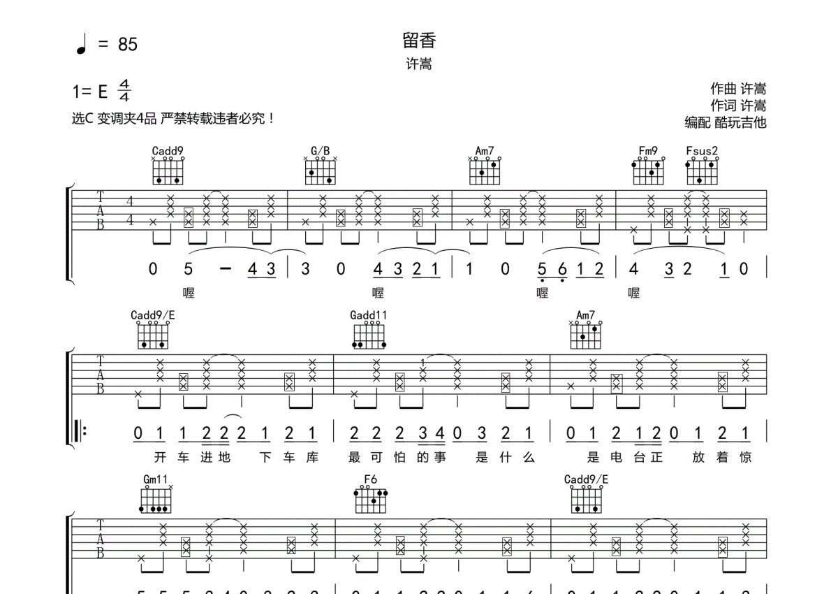 许嵩《留香》吉他谱 - C调弹唱六线谱