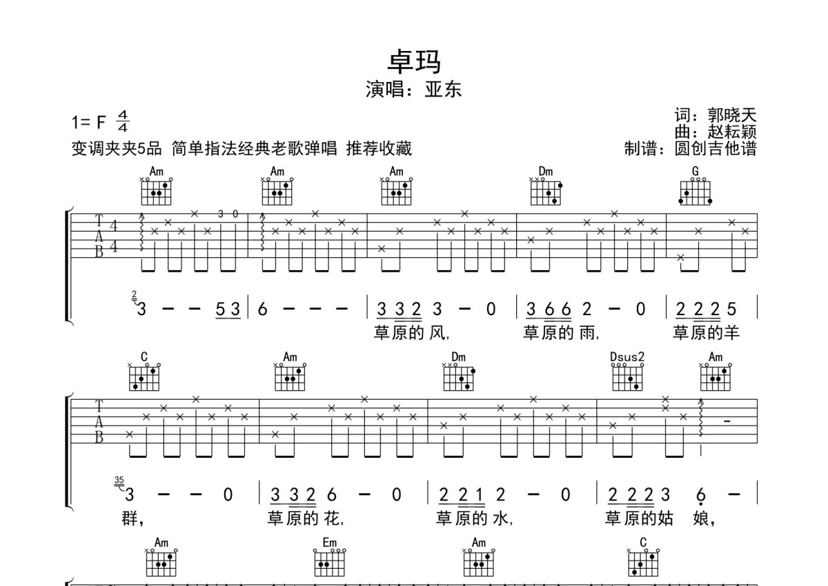 《卓玛》是亚东演唱的一首歌曲,分解加扫弦编配,本吉他谱采用的是C调指法编配,这份吉他谱共有三张高清图谱,图谱由 @圆创吉他谱 编配上传,图谱使用六线谱编配,包含吉他和弦指法、简谱以及歌词部分,曲谱配备了相关的音频提供试听,使用这份卓玛吉他谱,可以让你更加方便地掌握这首歌曲的弹唱技巧,快来尝试吧。经典老歌 推荐。