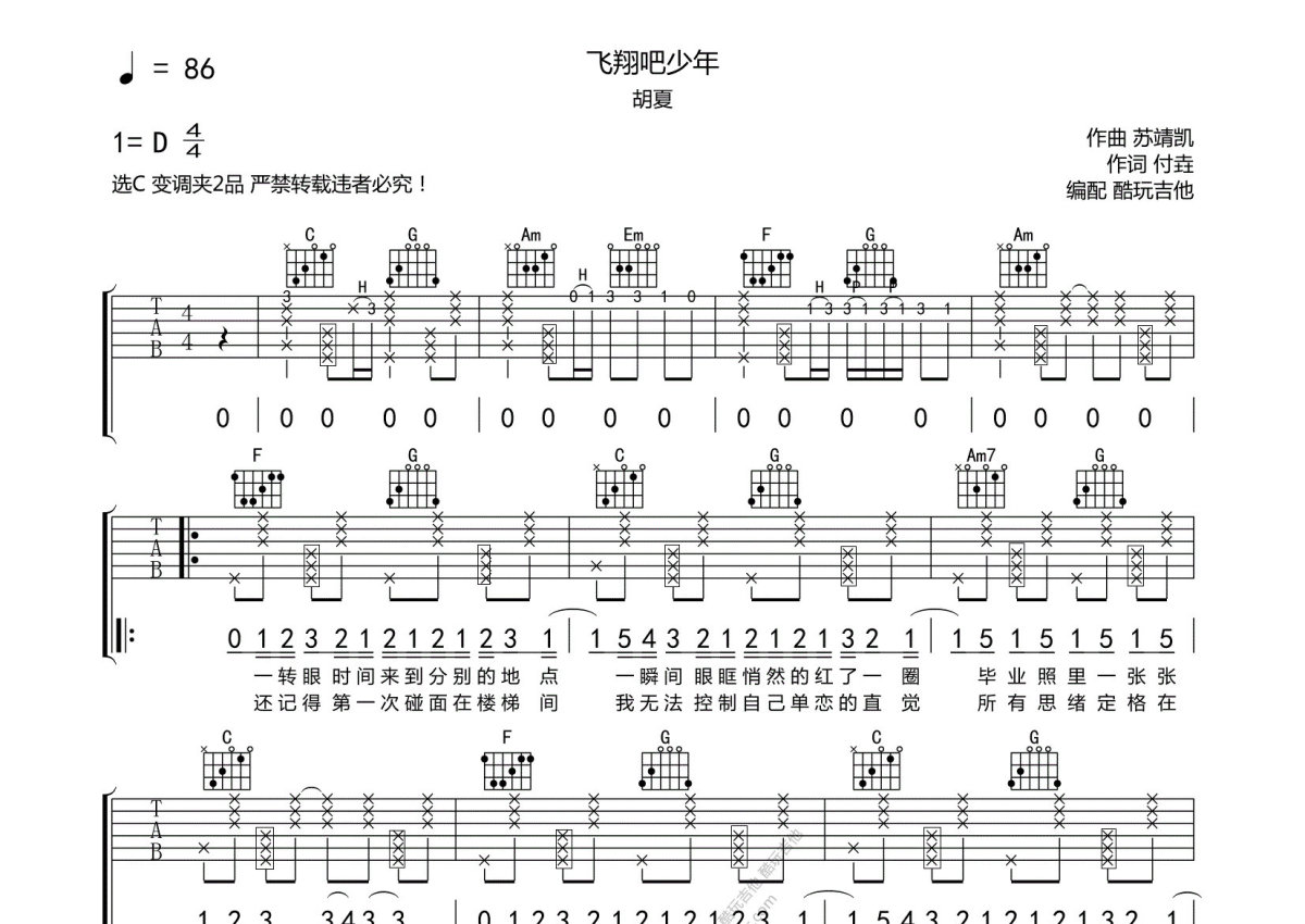 胡夏《飞翔吧少年》吉他谱 - C调弹唱六线谱