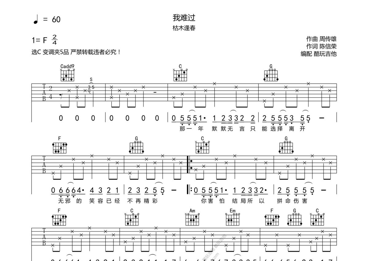 枯木逢春《我难过》吉他谱 - C调弹唱六线谱