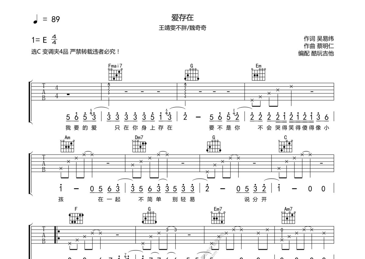 魏奇奇/王靖雯不胖《爱,存在》吉他谱 - C调弹唱六线谱