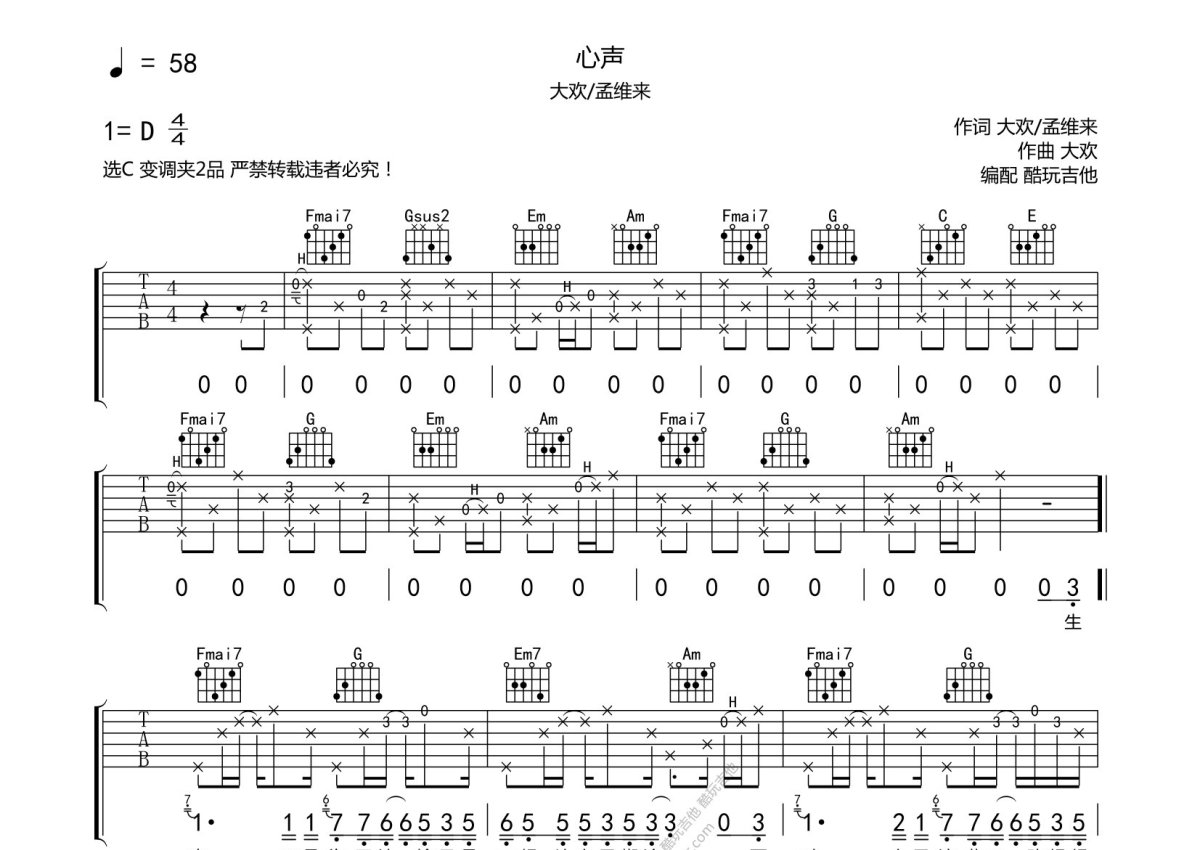 大欢/孟维来《心声》吉他谱 - C调弹唱六线谱