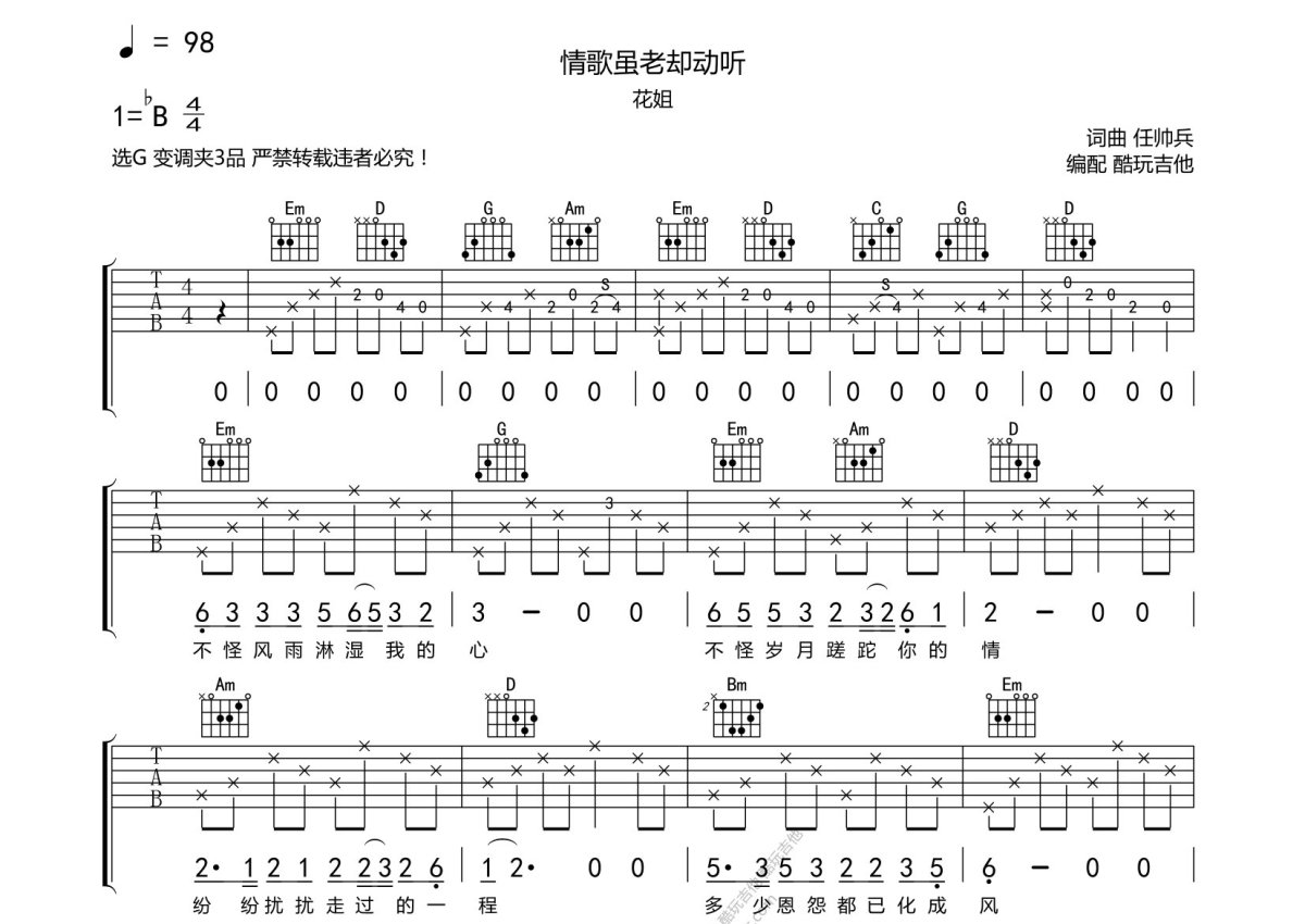 花姐《情歌虽老却动听》吉他谱 - G调弹唱六线谱