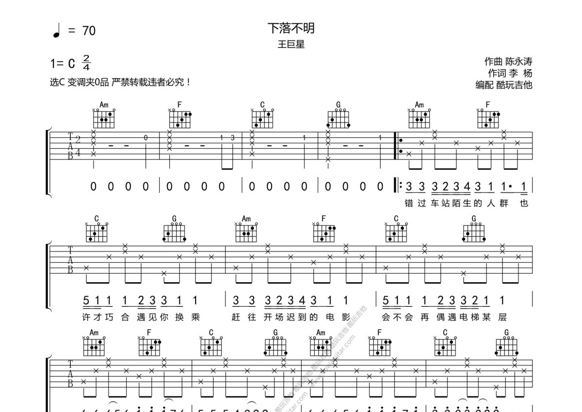 王巨星《下落不明》吉他谱 - C调弹唱六线谱