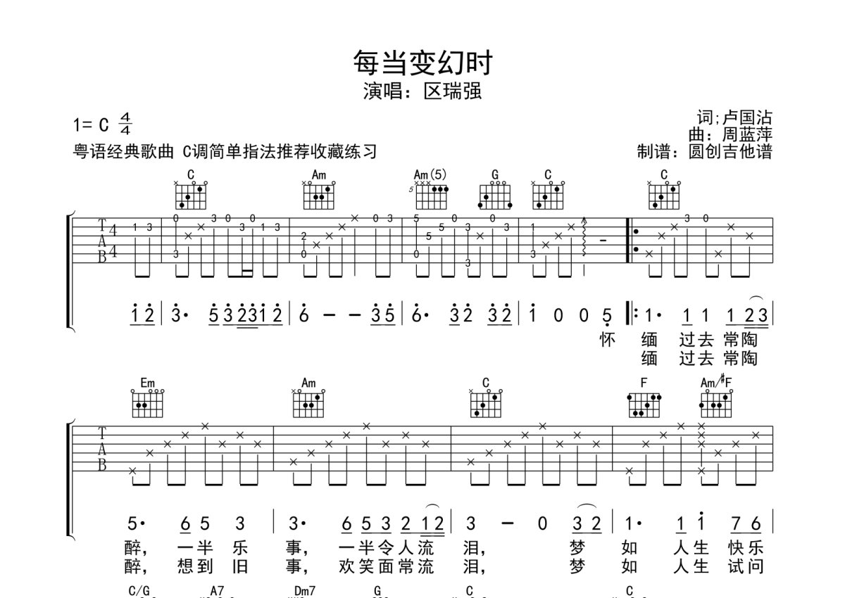 《每当变幻时》是曲瑞强演唱的一首歌曲,分解加扫弦编配,本吉他谱采用的是C调指法编配,这份吉他谱共有两张高清图谱,图谱由 @圆创吉他谱 编配上传,图谱使用六线谱编配,包含吉他和弦指法、简谱以及歌词部分,曲谱配备了相关的音频提供试听,使用这份每当变幻时吉他谱,可以让你更加方便地掌握这首歌曲的弹唱技巧,快来尝试吧。经典粤语歌曲推荐。