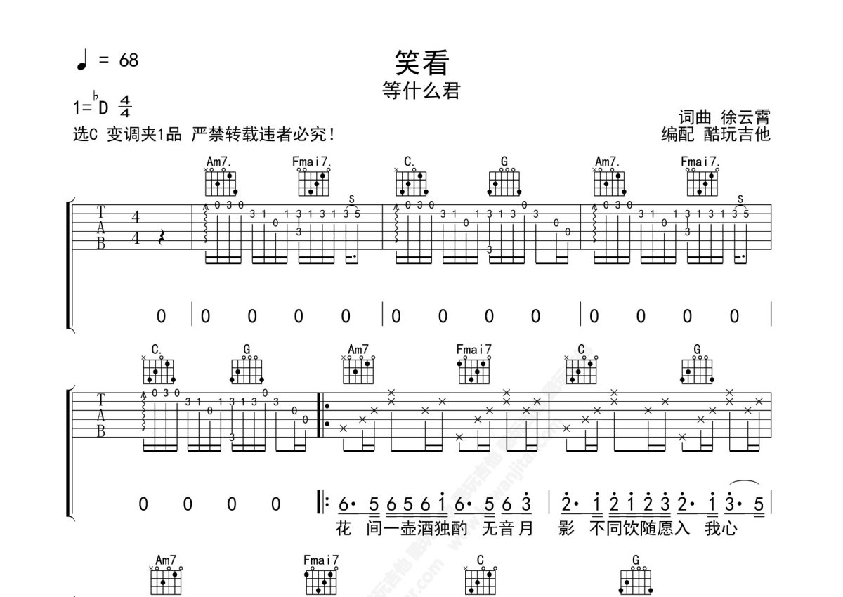 《笑看》是等什么君演唱的一首歌曲,本吉他谱采用的是C调指法编配,这份吉他谱共有三张高清图谱,图谱由 @酷玩吉他 编配上传,图谱使用六线谱编配,包含吉他和弦指法、简谱以及歌词部分,曲谱配备了相关的音频提供试听,使用这份笑看吉他谱,可以让你更加方便地掌握这首歌曲的弹唱技巧,快来尝试吧。等什么君《笑看》吉他谱_C调吉他弹唱谱。