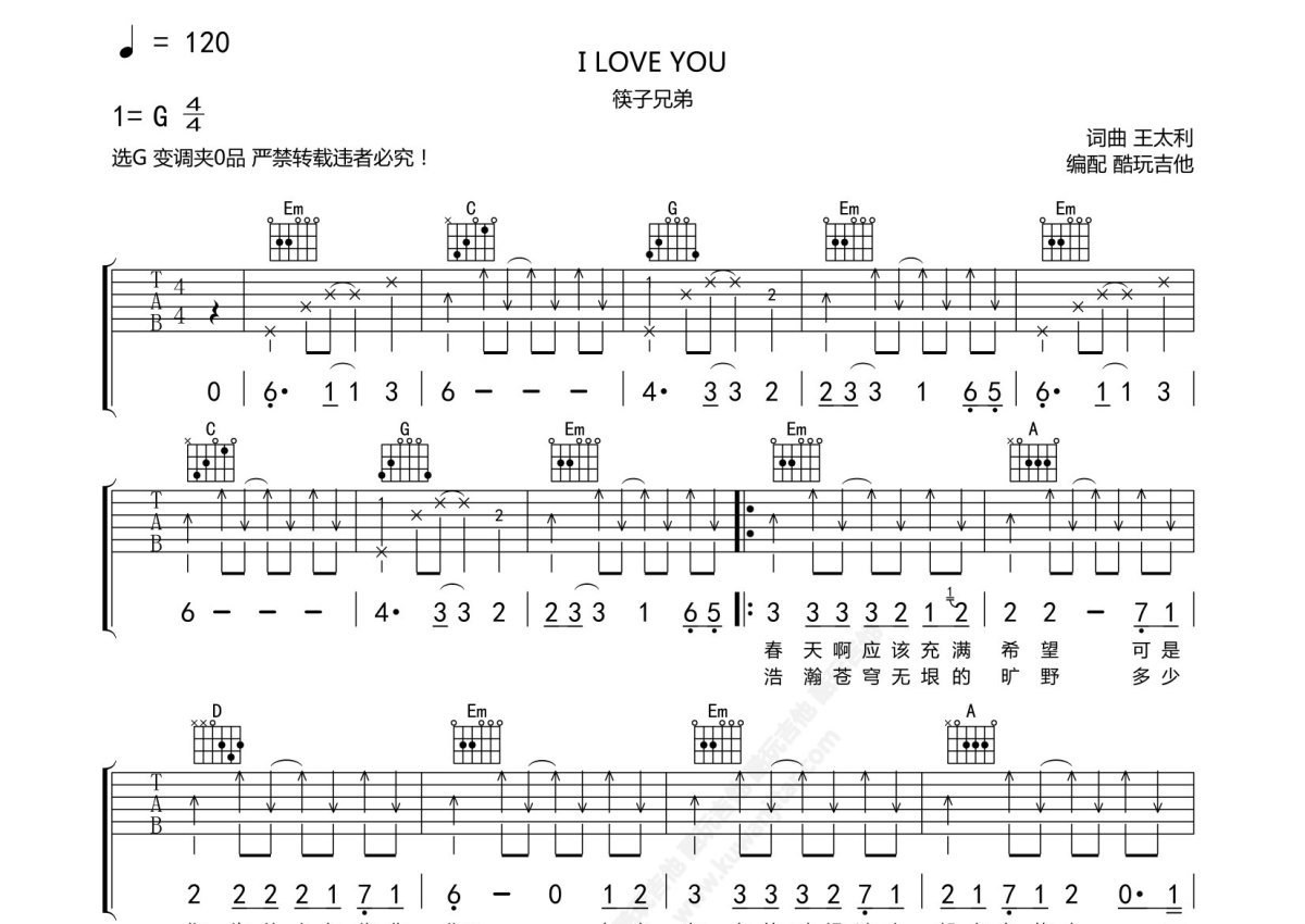 筷子兄弟《I LOVE YOU》吉他谱 - G调弹唱六线谱