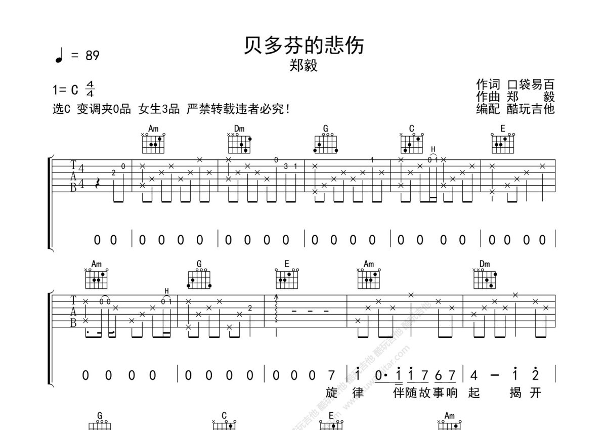 郑毅《贝多芬的悲伤》吉他谱 - C调弹唱六线谱
