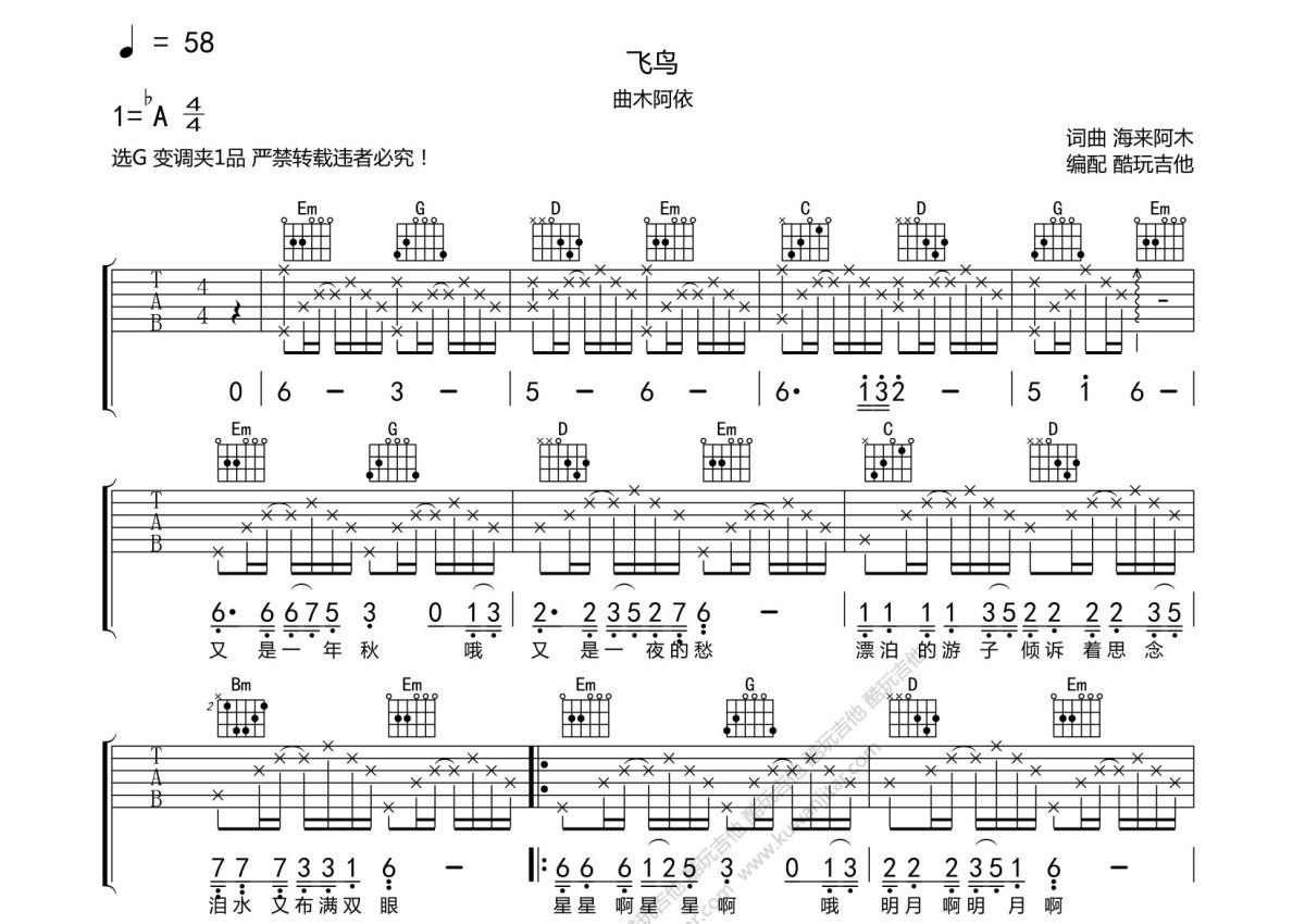 曲木阿依《飞鸟》吉他谱 - G调弹唱六线谱
