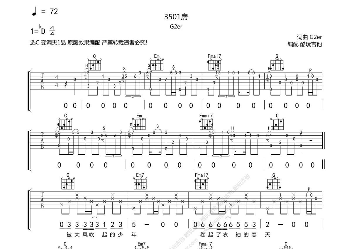 G2er《3501房》吉他谱 - C调弹唱六线谱