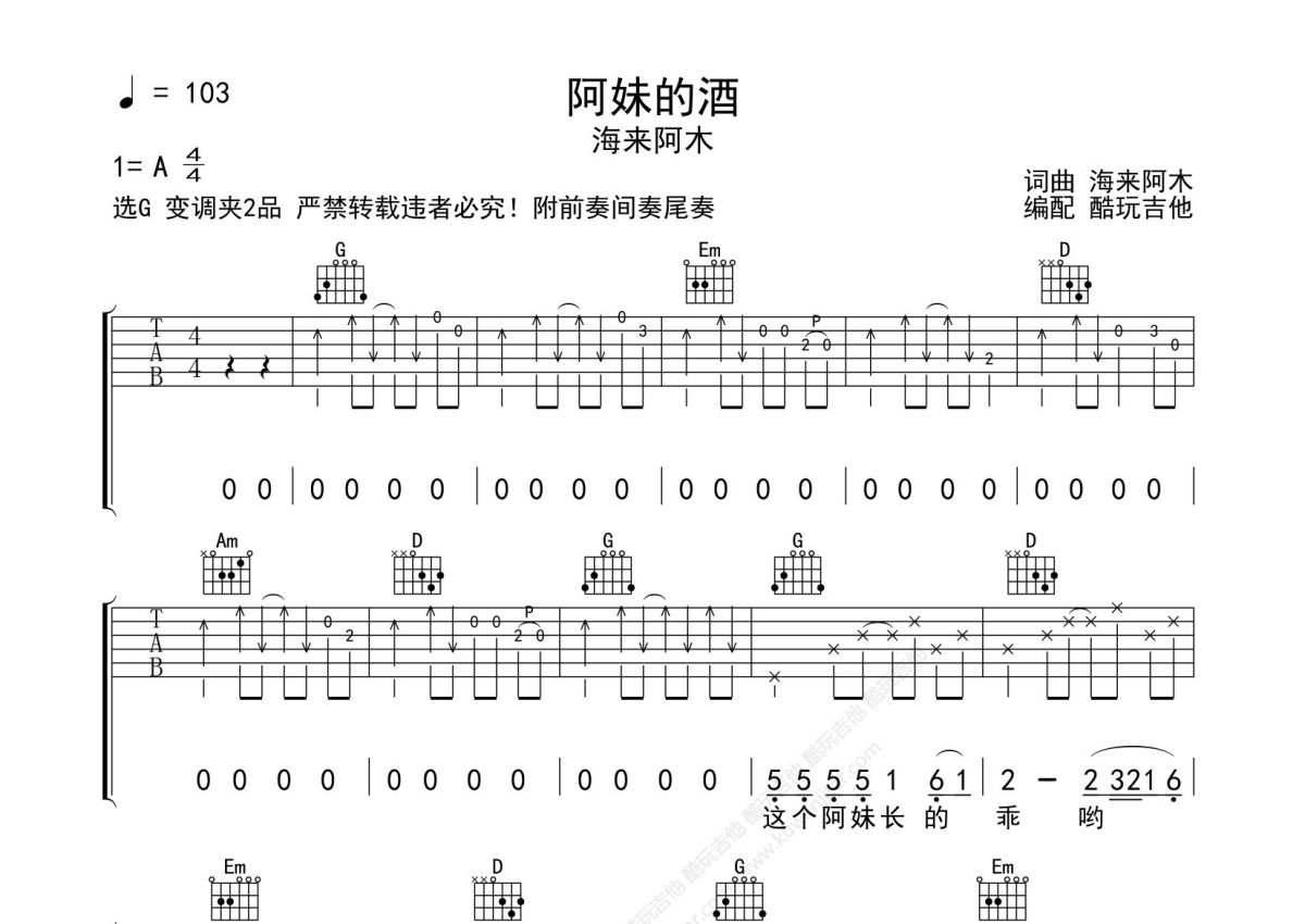 海来阿木《阿妹的酒》吉他谱 - G调弹唱六线谱