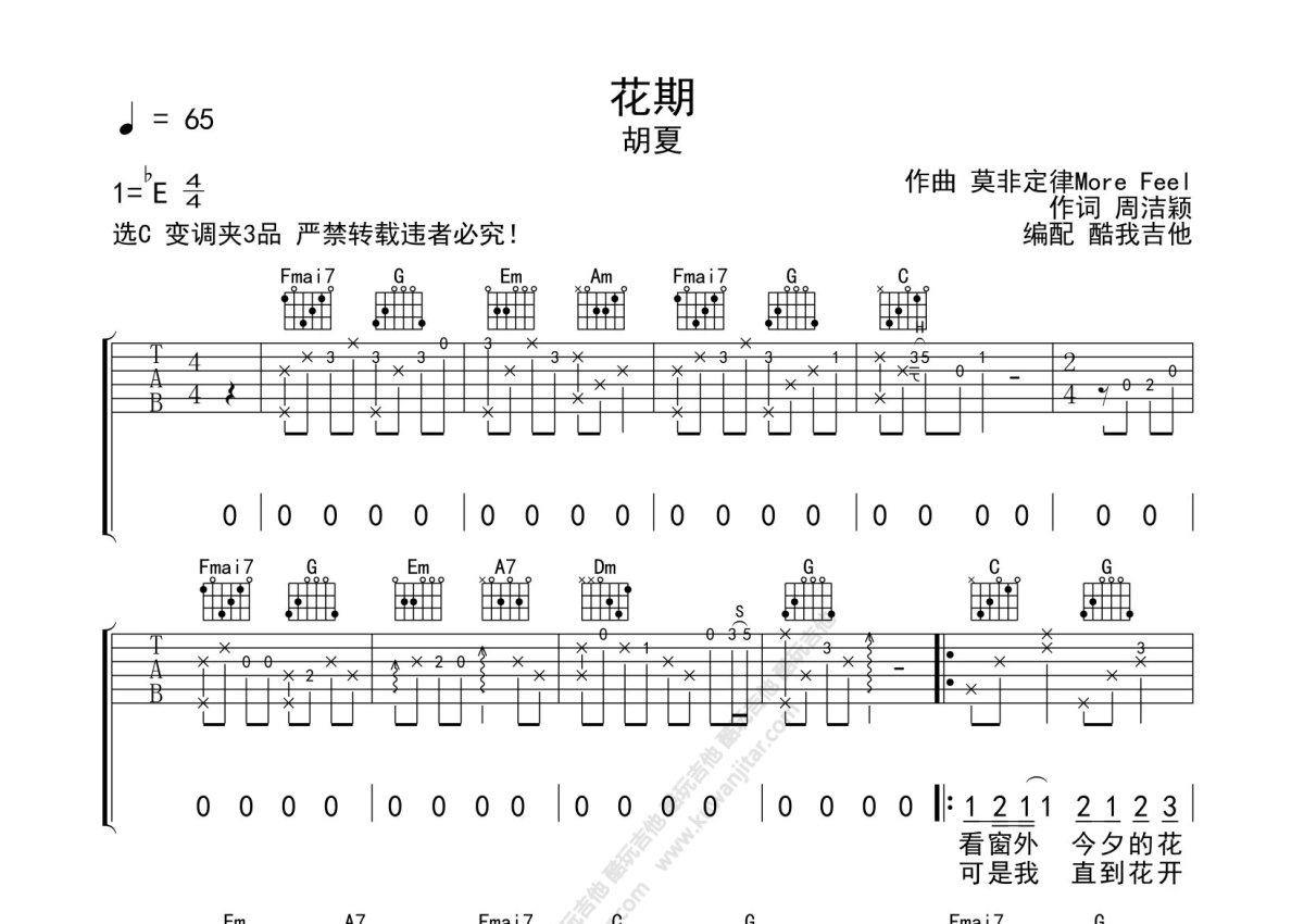 胡夏《花期》吉他谱 - C调弹唱六线谱