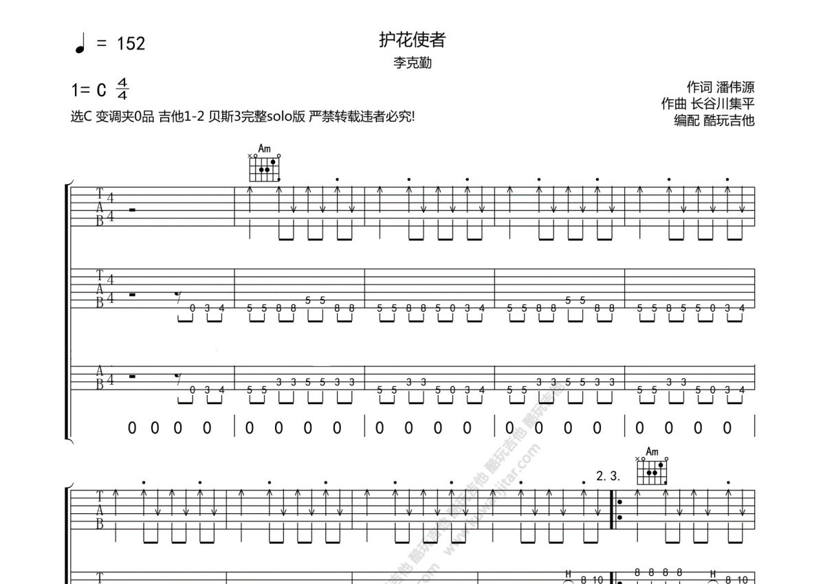 李克勤《护花使者》吉他谱 - C调弹唱六线谱 - 附solo和贝斯