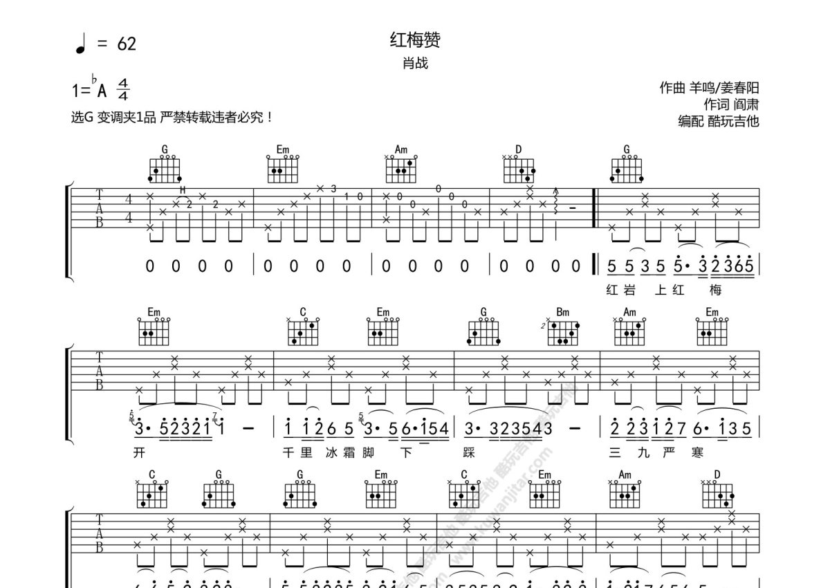 肖战《红梅赞》吉他谱 - G调弹唱六线谱