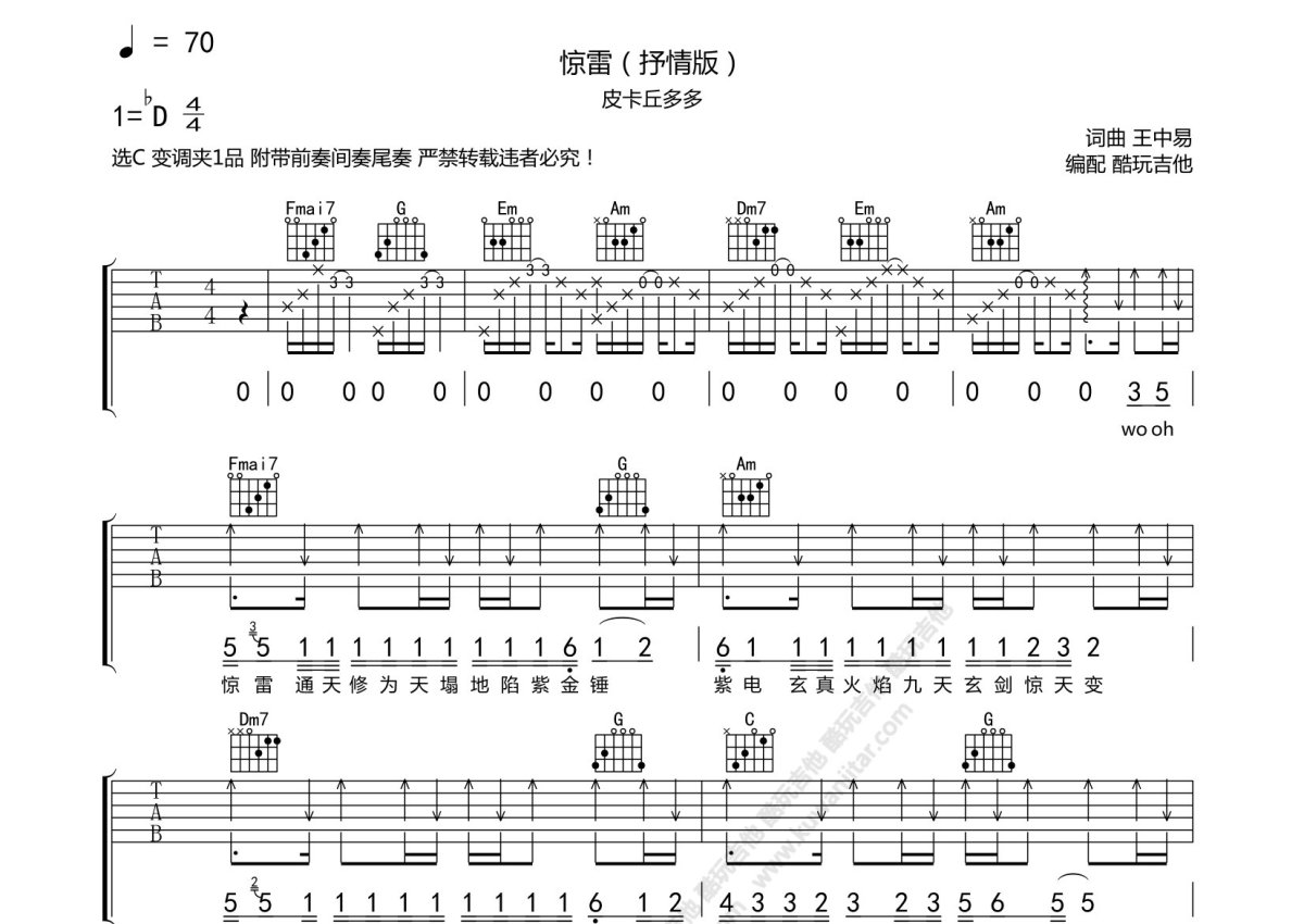 皮卡丘多多《惊雷》吉他谱 - C调弹唱六线谱 - 抒情版