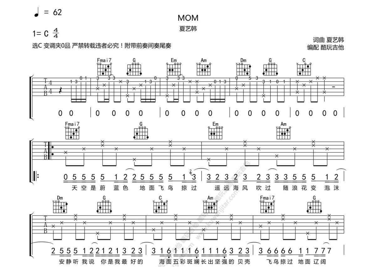 夏艺韩《MOM》吉他谱 - C调弹唱六线谱