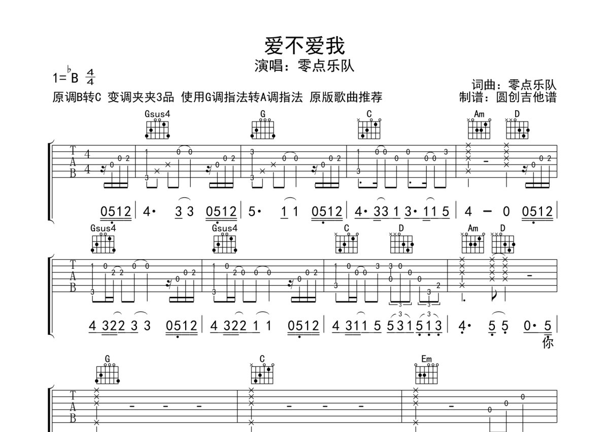 《爱不爱我》是零点乐队演唱的一首歌曲,分解加扫弦编配,本吉他谱采用的是G调指法编配,这份吉他谱共有四张高清图谱,图谱由 @圆创吉他谱 编配上传,图谱使用六线谱编配,包含吉他和弦指法、简谱以及歌词部分,曲谱配备了相关的音频提供试听,使用这份爱不爱我吉他谱,可以让你更加方便地掌握这首歌曲的弹唱技巧,快来尝试吧。经典歌曲原版弹唱。