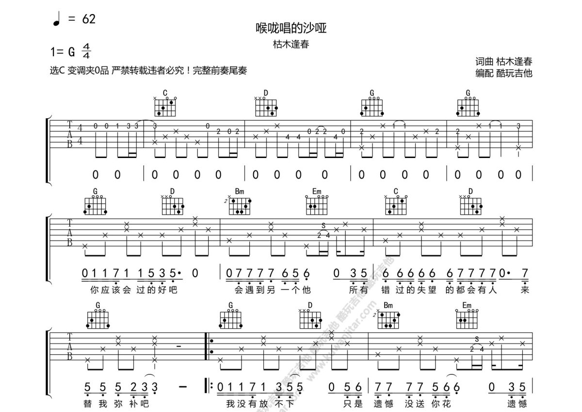 枯木逢春《喉咙唱的沙哑》吉他谱 - C调弹唱六线谱