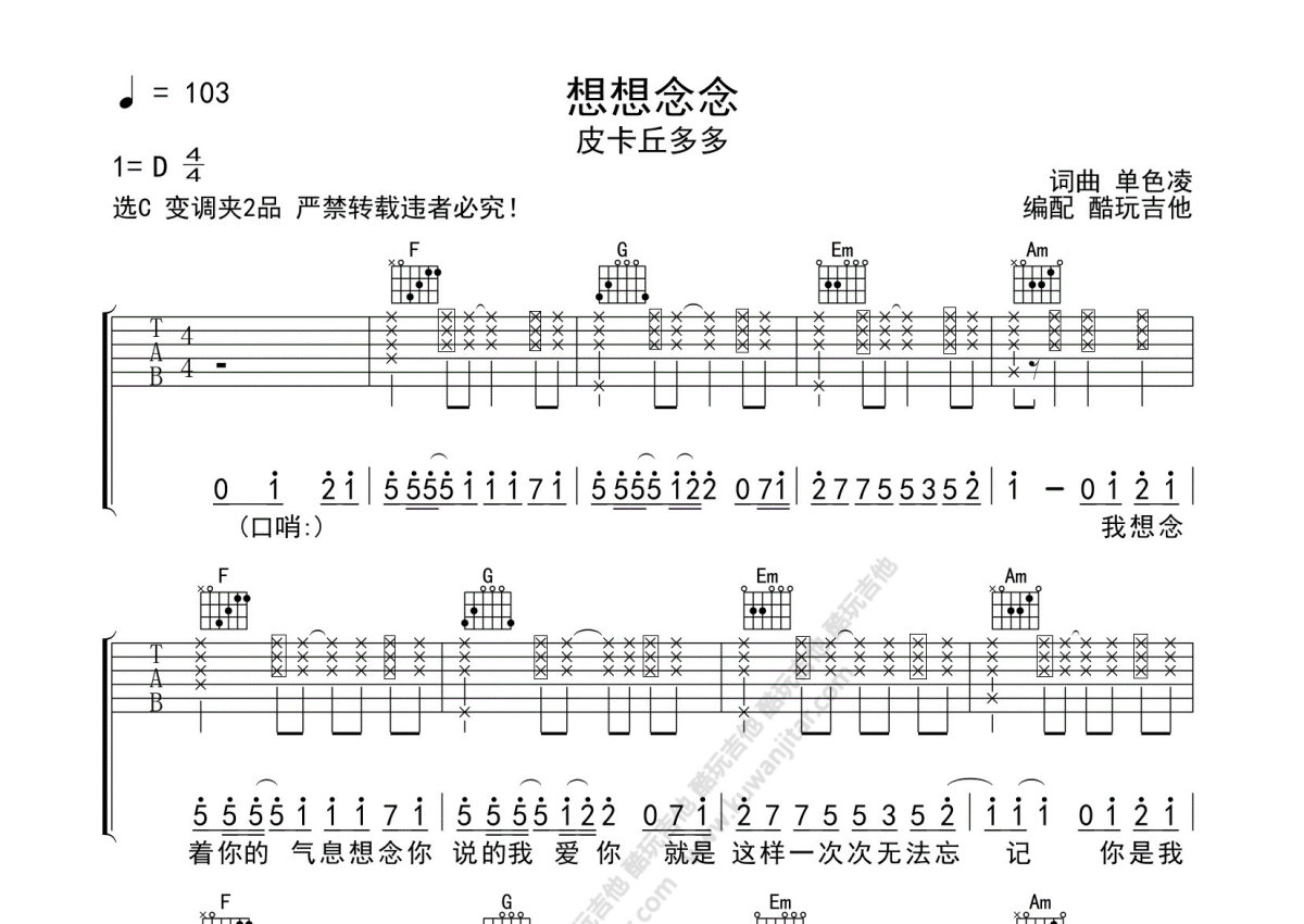 皮卡丘多多《想想念念》吉他谱 - C调弹唱六线谱