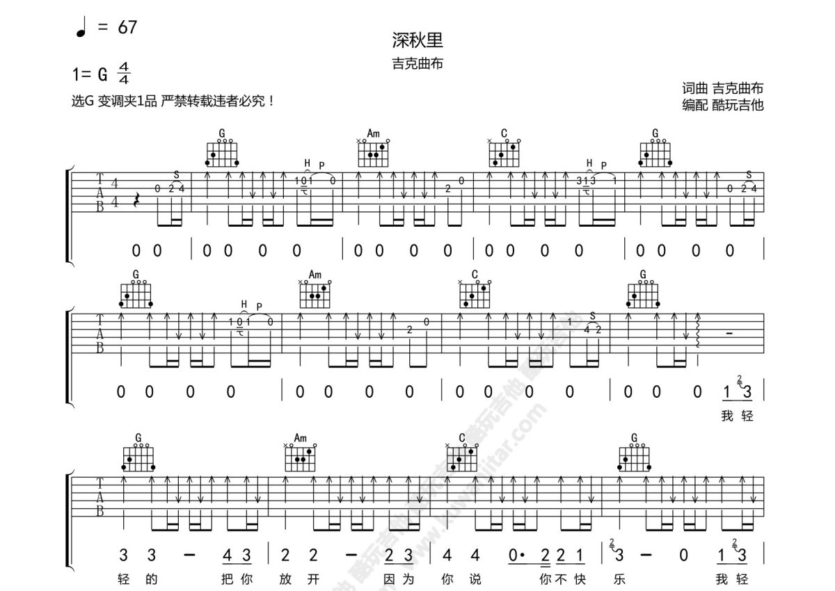 吉克曲布《深秋里》吉他谱 - G调弹唱六线谱