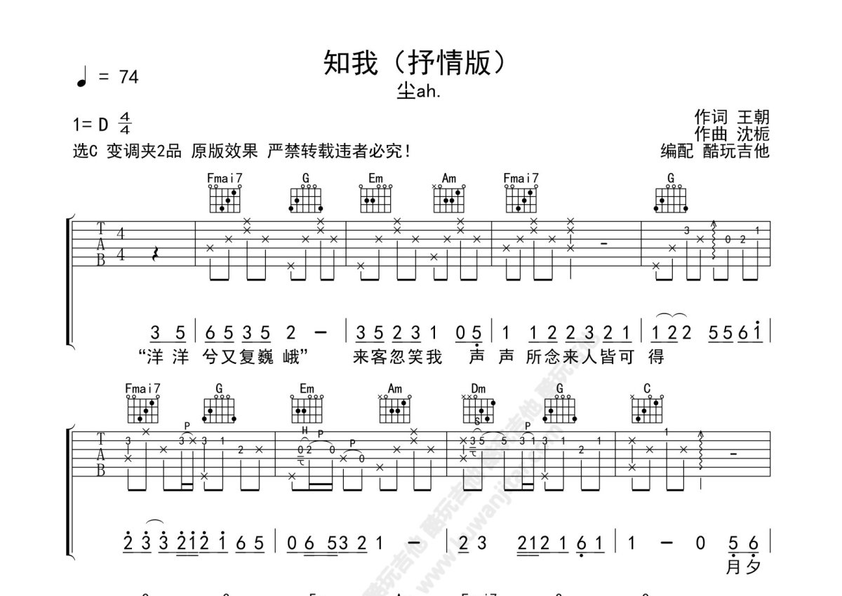 尘ah《知我》吉他谱 - C调弹唱六线谱 - 抒情版