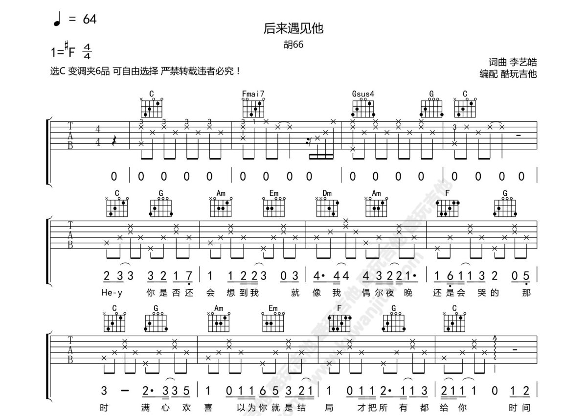 胡66《后来遇见他》吉他谱 - C调弹唱六线谱