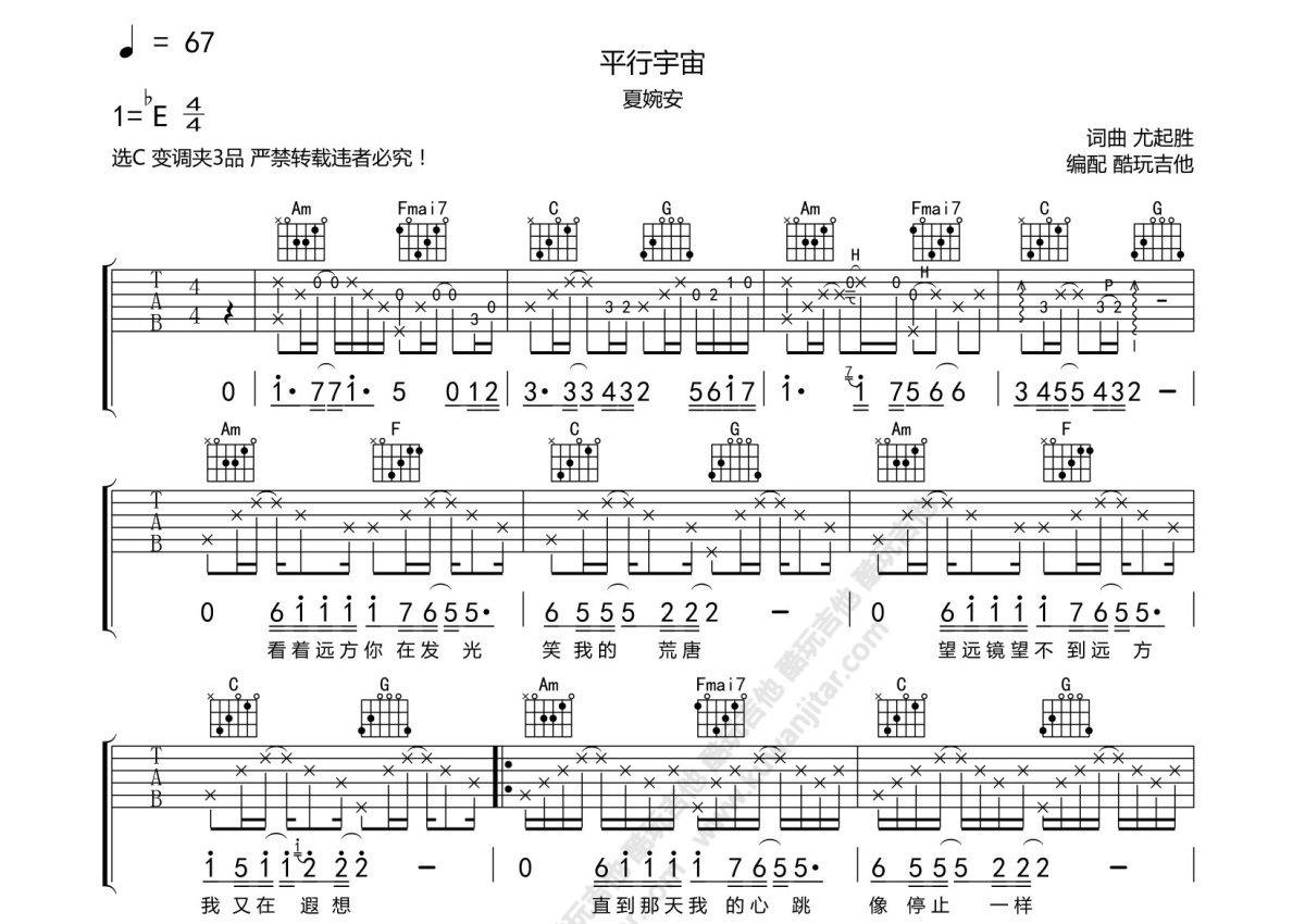 夏婉安《平行宇宙》吉他谱 - C调弹唱六线谱