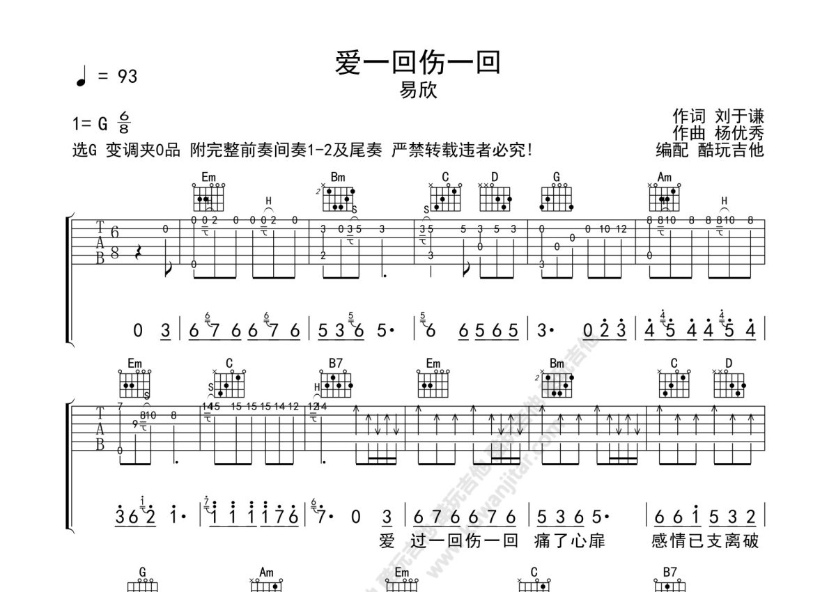 易欣《爱过一回伤一回》吉他谱 - G调弹唱六线谱
