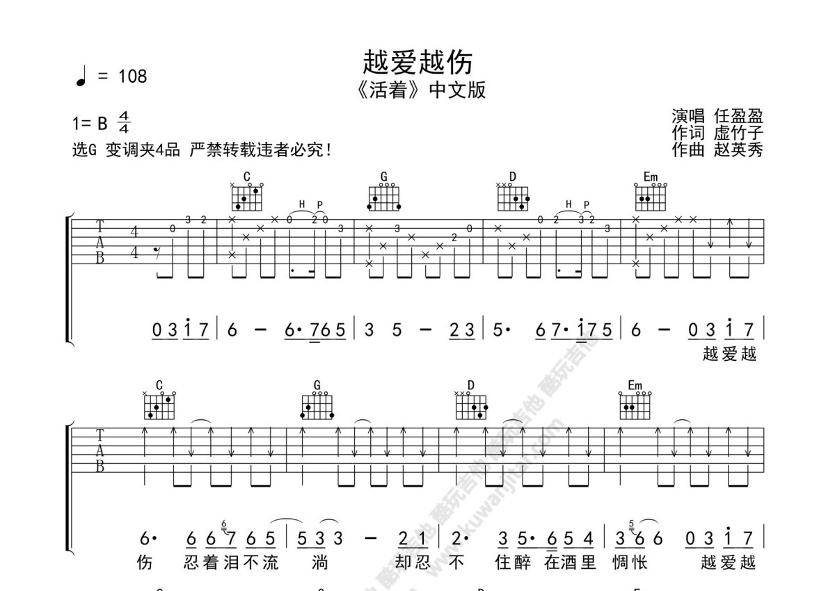 洪真英《越爱越伤》吉他谱 - G调弹唱六线谱