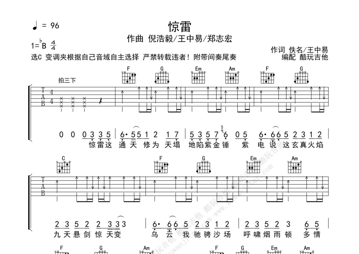 倪浩毅《惊雷》吉他谱 - C调弹唱六线谱