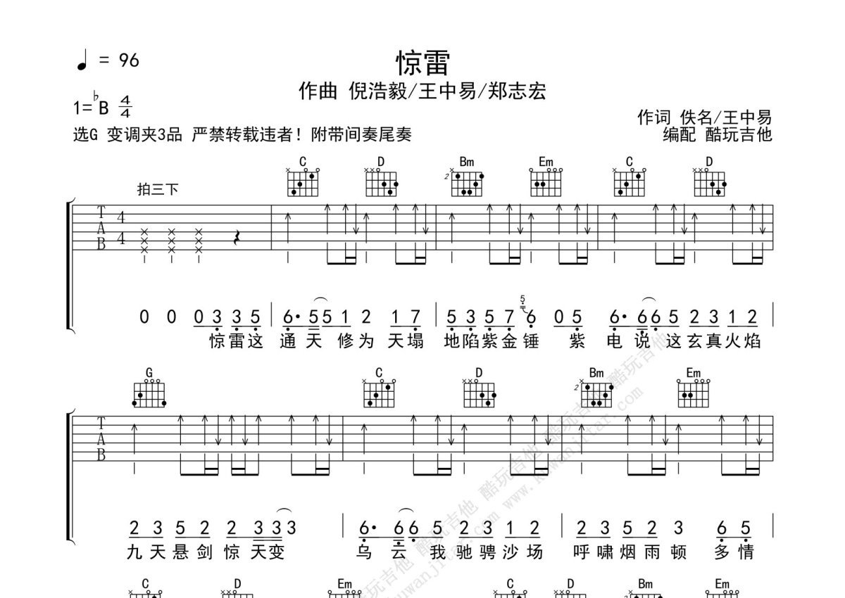 倪浩毅《惊雷》吉他谱 - G调弹唱六线谱