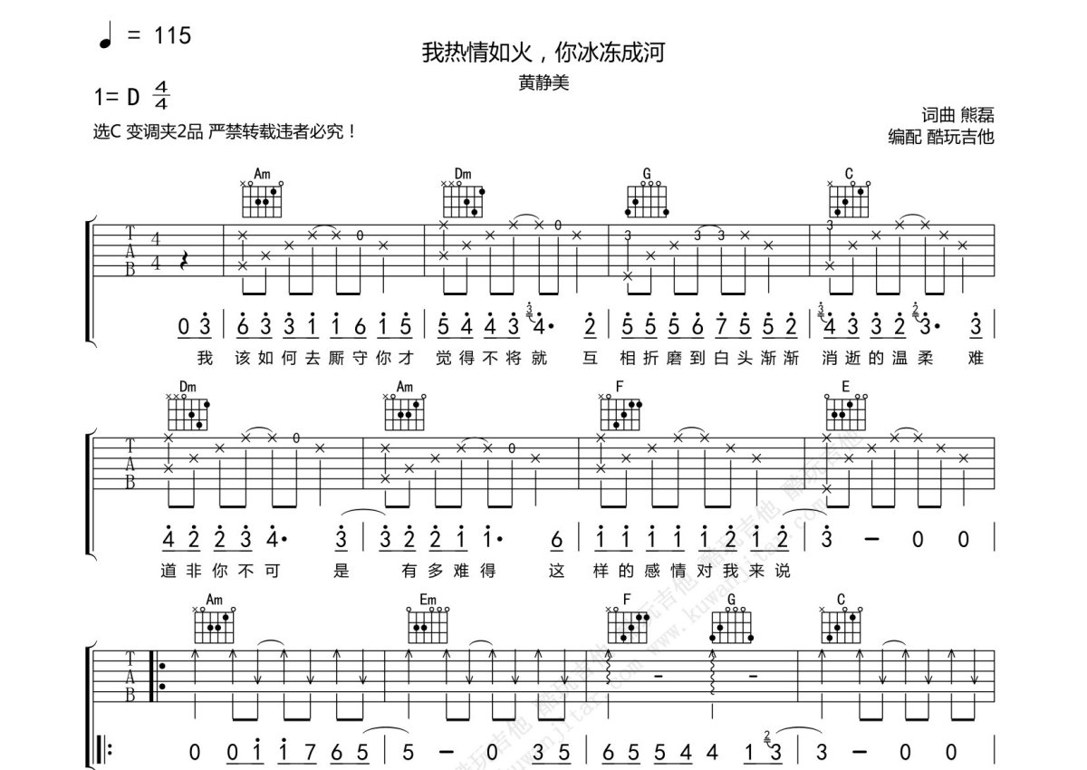 《我热情如火,你冰冻成河》是黄静美演唱的一首歌曲,本吉他谱采用的是C调指法编配,这份吉他谱共有三张高清图谱,图谱由 @酷玩吉他 编配上传,图谱使用六线谱编配,包含吉他和弦指法、简谱以及歌词部分,曲谱配备了相关的音频提供试听,使用这份我热情如火,你冰冻成河吉他谱,可以让你更加方便地掌握这首歌曲的弹唱技巧,快来尝试吧。黄静美《我热情如火,你冰冻成河》吉他谱_C调吉他弹唱谱。