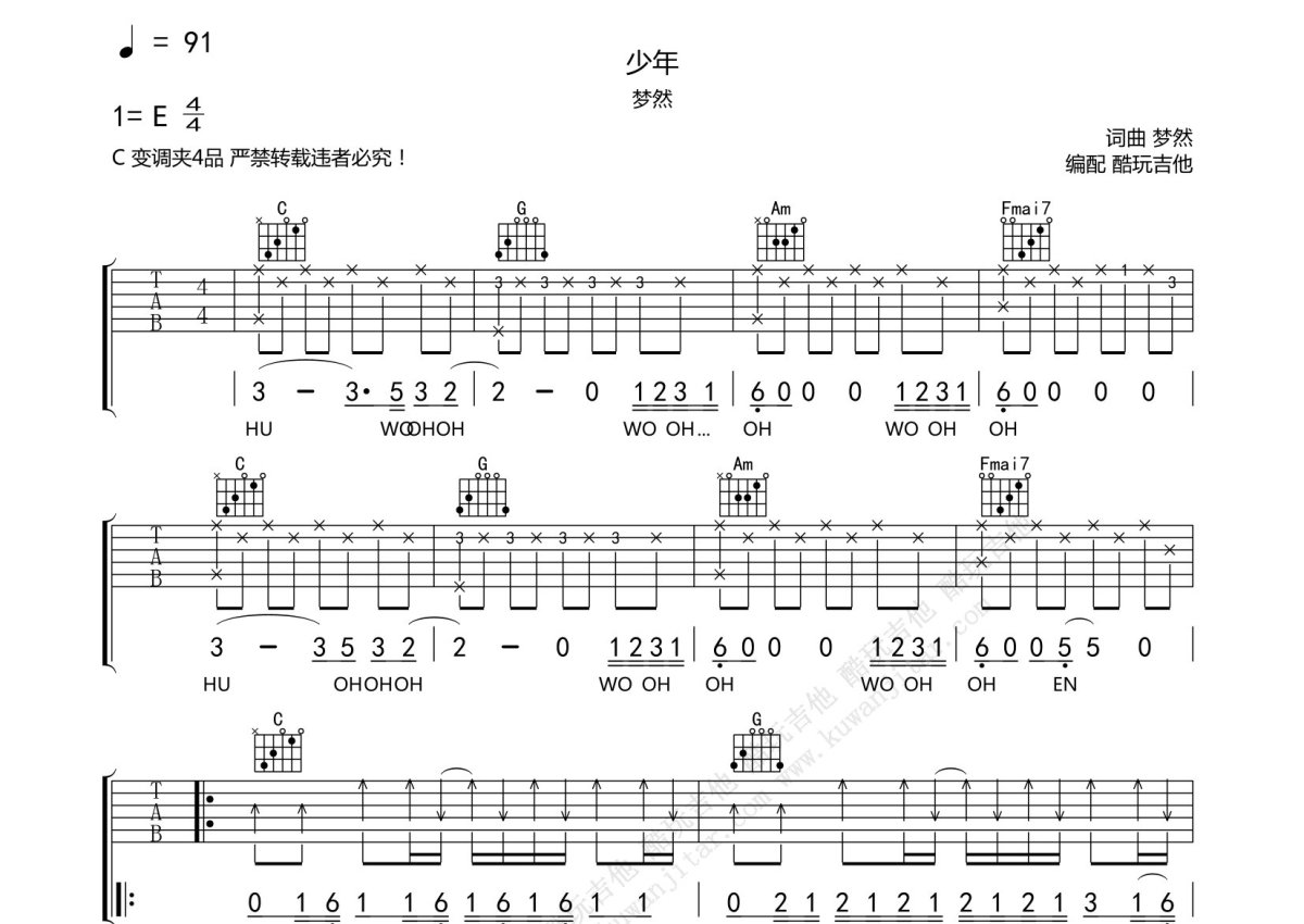 梦然《少年》吉他谱 - C调弹唱六线谱