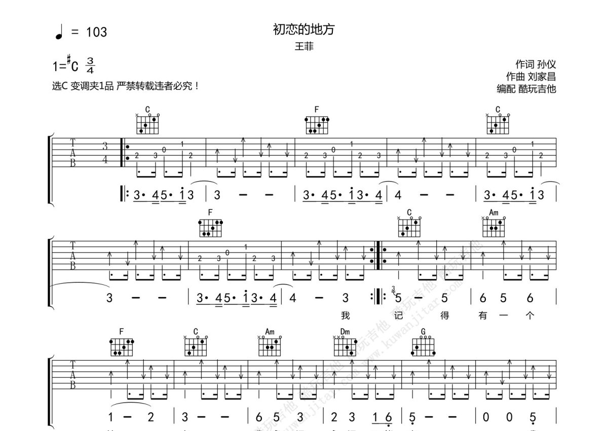 王菲《初恋的地方》吉他谱 - C调弹唱六线谱