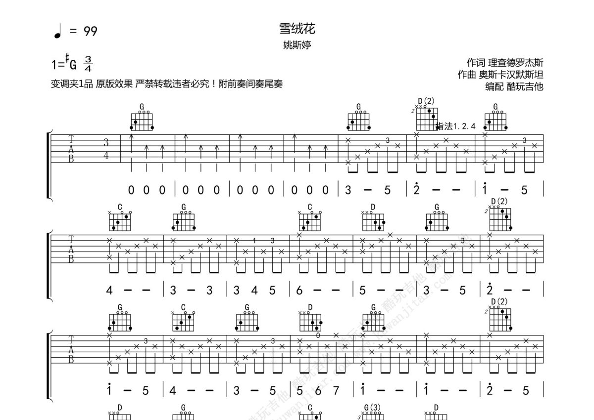 《雪绒花》是姚斯婷演唱的一首歌曲,本吉他谱采用的是G调指法编配,这份吉他谱共有三张高清图谱,图谱由 @酷玩吉他 编配上传,图谱使用六线谱编配,包含吉他和弦指法、简谱以及歌词部分,曲谱配备了相关的音频提供试听,使用这份雪绒花吉他谱,可以让你更加方便地掌握这首歌曲的弹唱技巧,快来尝试吧。姚斯婷《雪绒花》吉他谱_G调吉他弹唱谱。