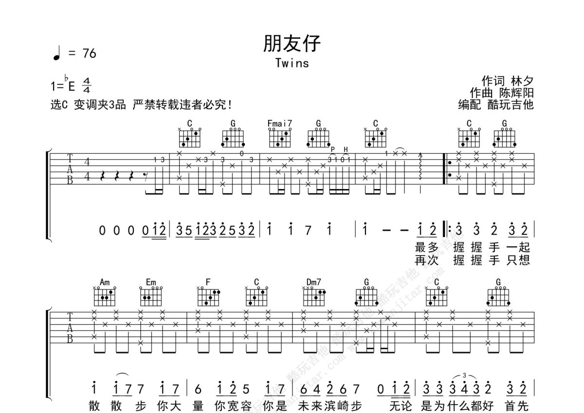 Twins《朋友仔》吉他谱 - C调弹唱六线谱
