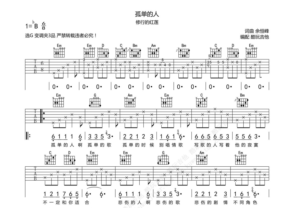 修行的红莲/棉袄姥爷《孤单的人》吉他谱 - G调弹唱六线谱