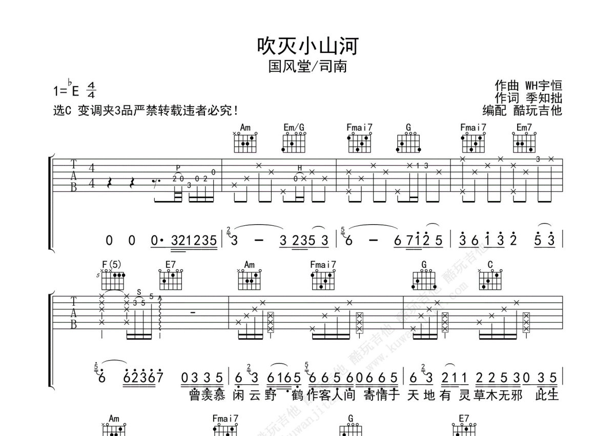 国风堂/司南《吹灭小山河》吉他谱 - C调弹唱六线谱