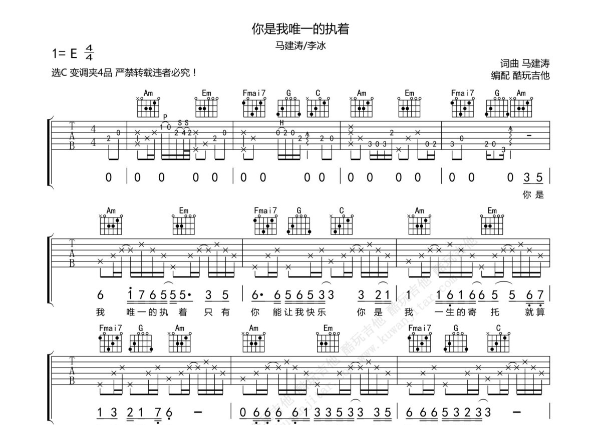 马健涛/李冰《你是我唯一的执着》吉他谱 - C调弹唱六线谱