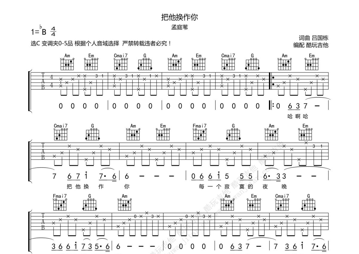 《把他换作你》是孟庭苇演唱的一首歌曲,本吉他谱采用的是C调指法编配,这份吉他谱共有三张高清图谱,图谱由 @酷玩吉他 编配上传,图谱使用六线谱编配,包含吉他和弦指法、简谱以及歌词部分,曲谱配备了相关的音频提供试听,使用这份把他换作你吉他谱,可以让你更加方便地掌握这首歌曲的弹唱技巧,快来尝试吧。孟庭苇《把他换作你》吉他谱_C调吉他弹唱谱。