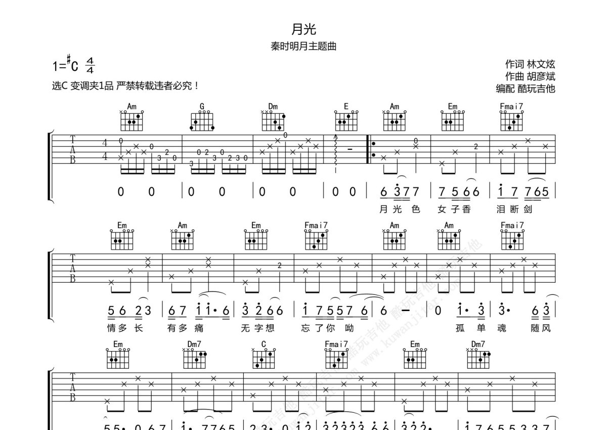 胡彦斌《月光》吉他谱 - C调弹唱六线谱
