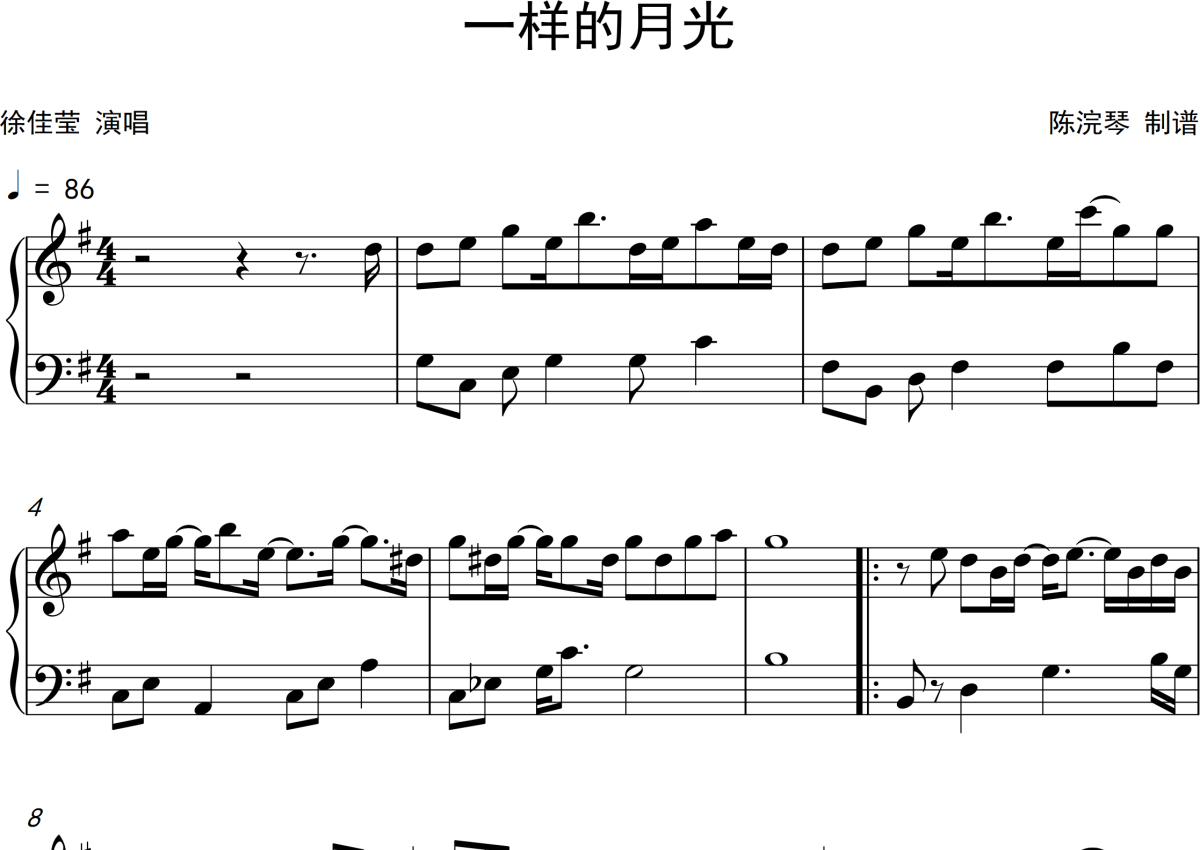 《一样的月光》是徐佳莹演唱的一首歌曲,这份钢琴谱共有两张高清图谱,图谱由 @月隐云先知 编配上传,曲谱配备了相关的音频提供试听,使用这份一样的月光钢琴谱,可以让你更加方便地掌握这首歌曲的演奏技巧,快来尝试吧。徐佳莹《一样的月光》钢琴谱。