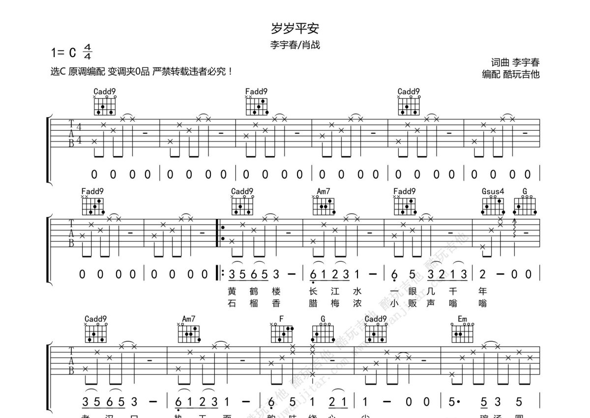 李宇春/肖战《岁岁平安》吉他谱 - C调弹唱六线谱