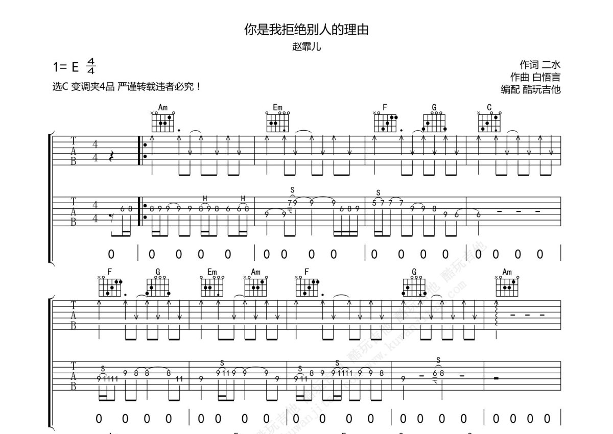 赵霏儿《你是我拒绝别人的理由》吉他谱 - C调弹唱六线谱 - 附SOLO